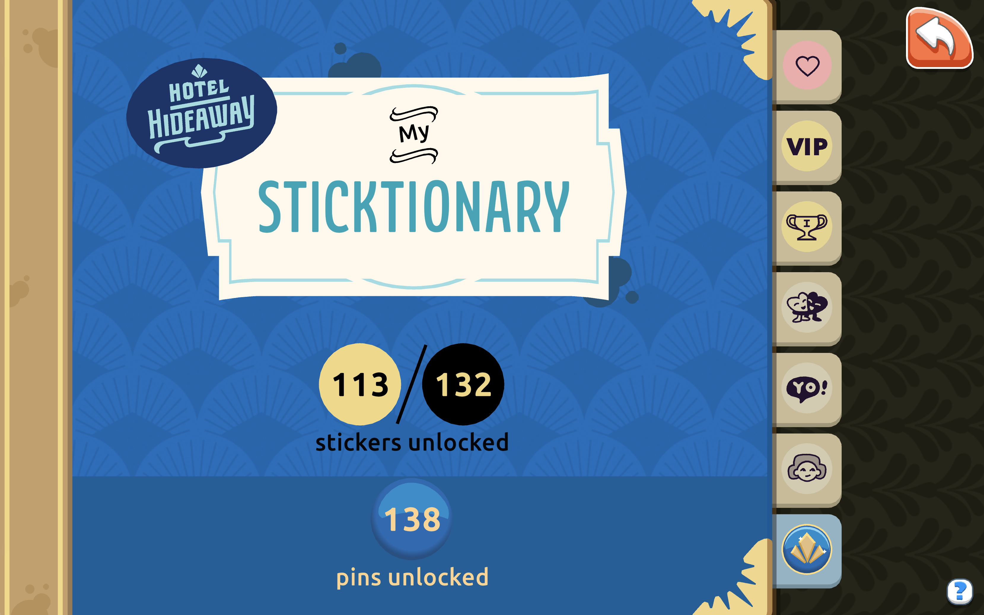 The stickers are used as emoji on the chat and allow you to personalize your profile. There are 5 collections of stickers throughout the game: Relationships, Symbols, Characters, Achievements and depending on your VIP Club membership in the game. Today, there are over 114 stickers in Hotel Hideaway.